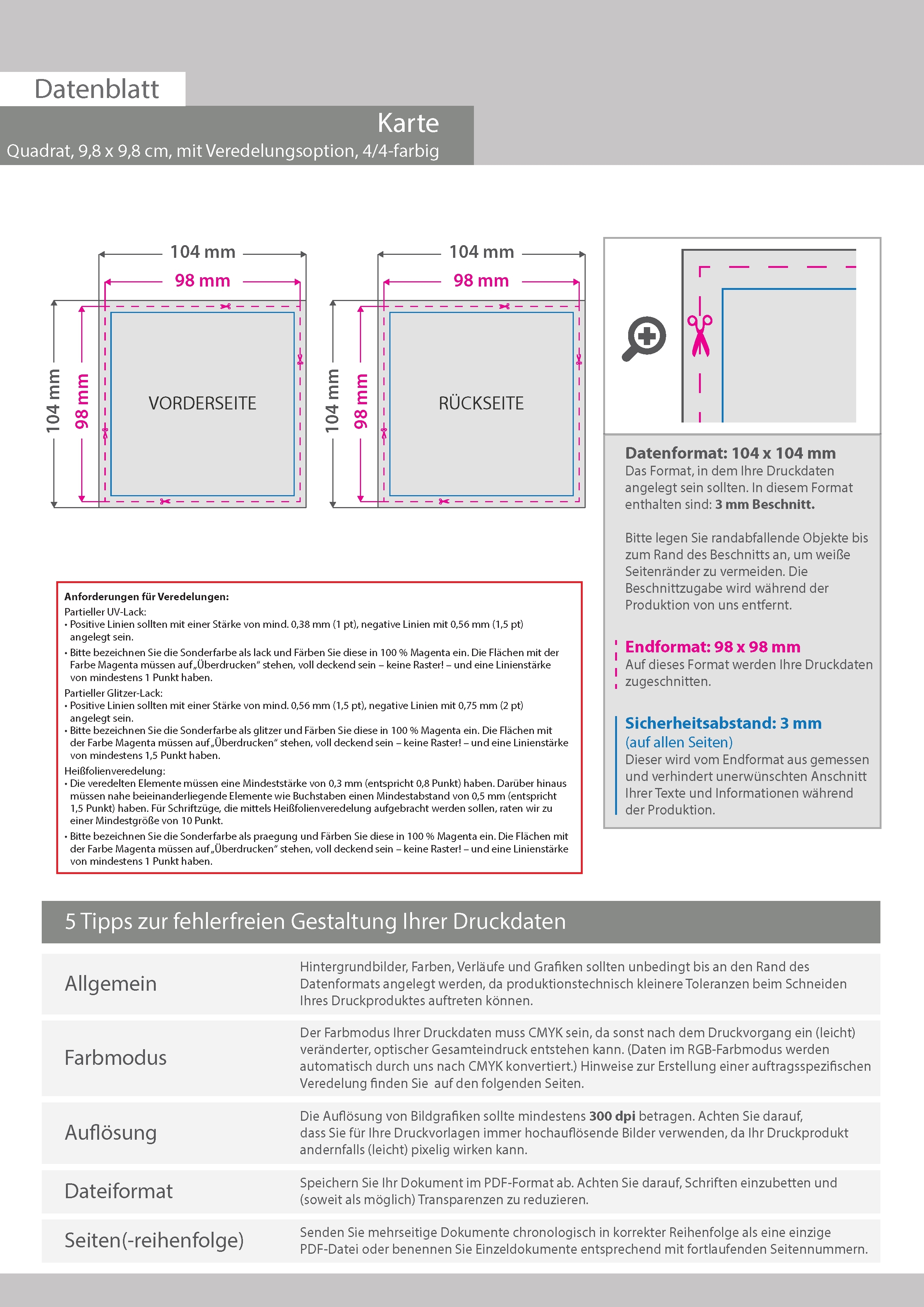 Postkarte, Quadrat 9,8 x 9,8 cm, mit allen Veredelungskombinationen