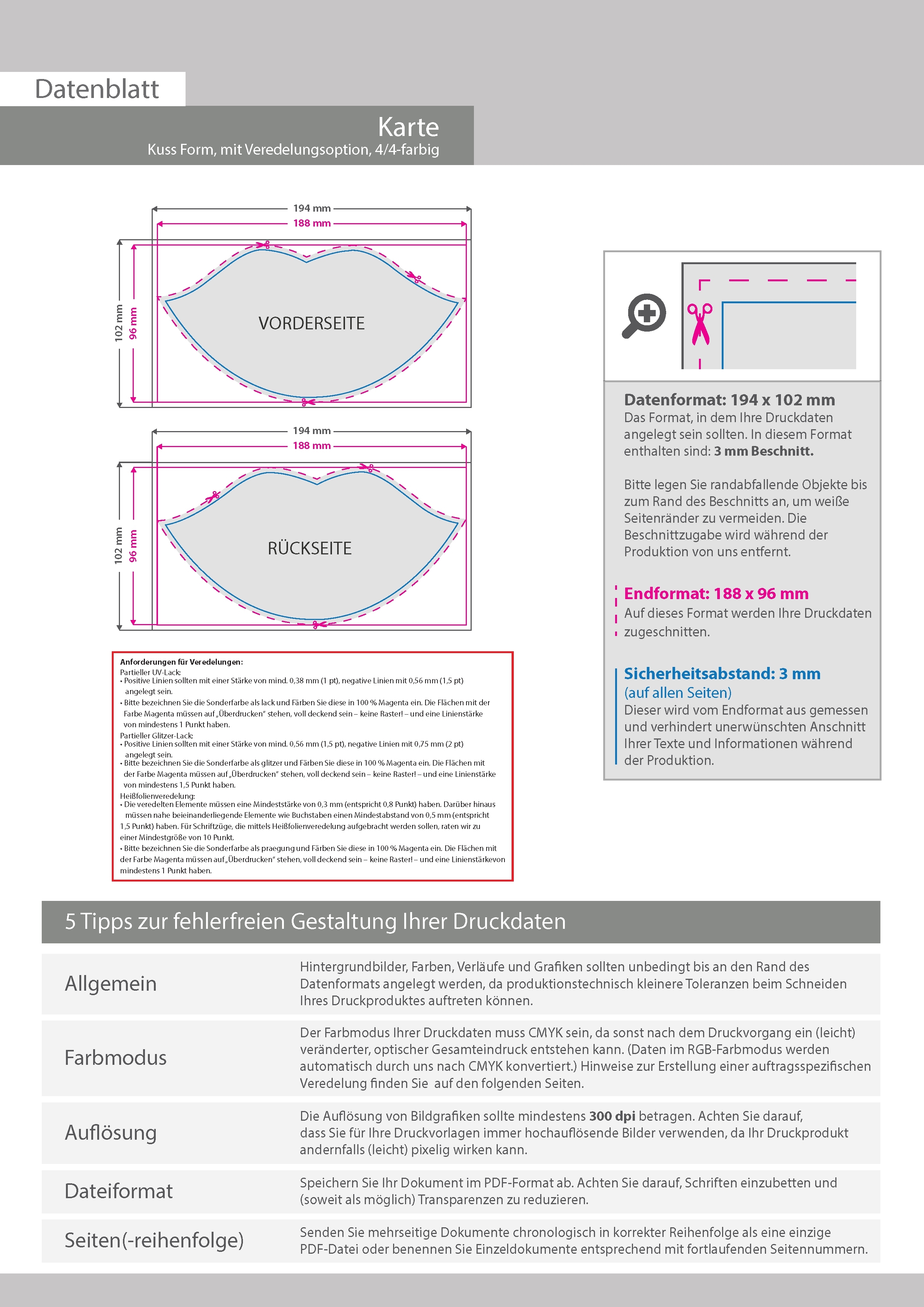 Postkarte, Stanzform Kuss, mit allen Veredelungskombinationen