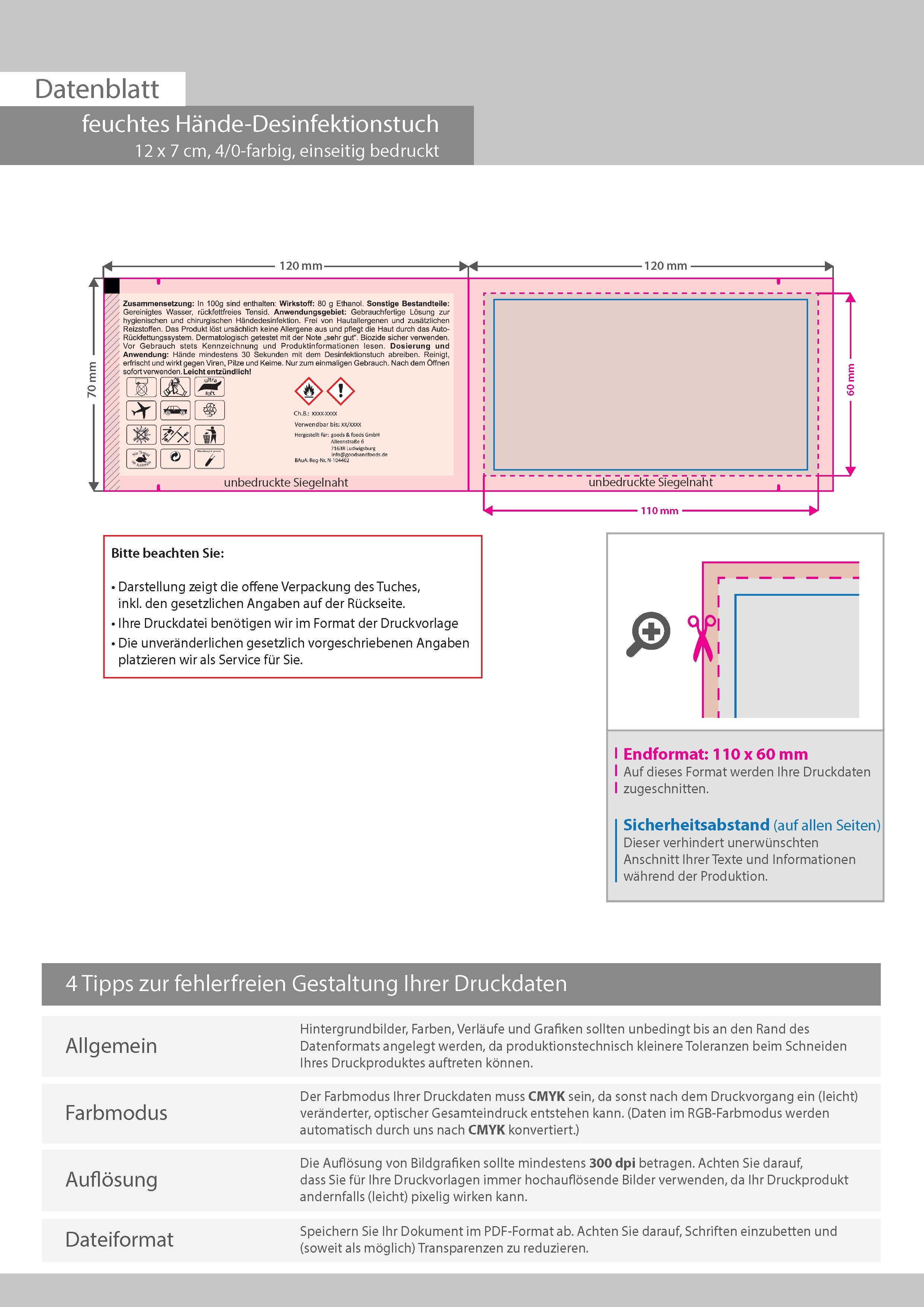 Hände-Desinfektionstuch, 14 x 7 cm, 4/0-farbig einseitig bedruckt